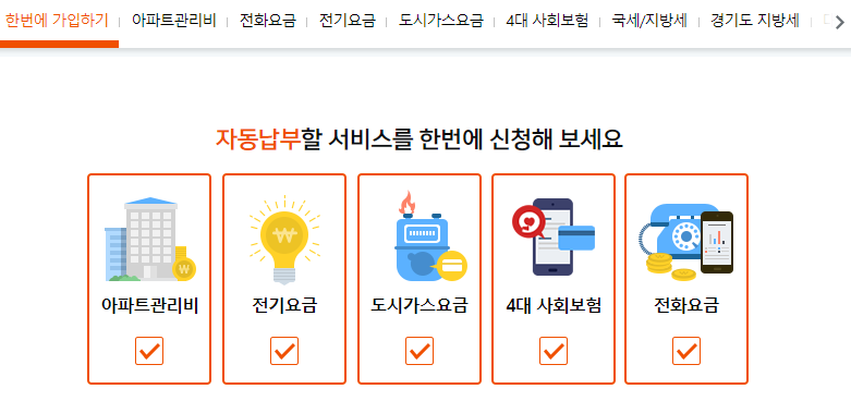 아파트 관리비 자동이체는 월 700원, 전기요금은 무료, 도시가스요금 역시 무료 등의 이벤트를 하고 있습니다.