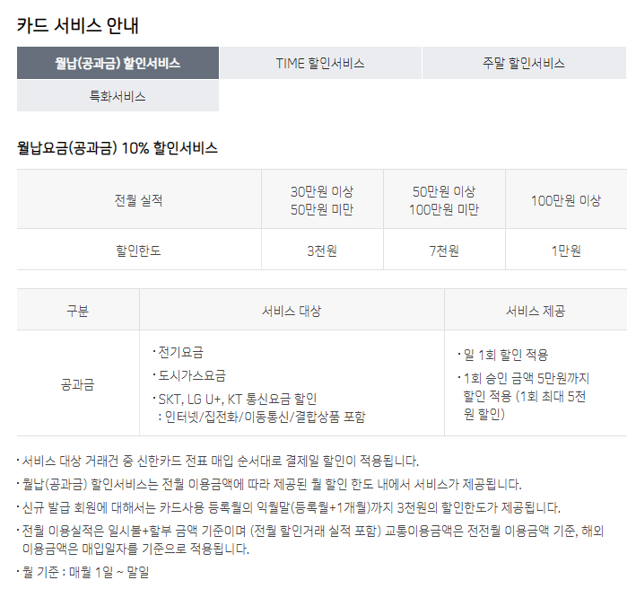 매월 나가는 공과금을 10% 할인해주며 여기에는 전기요금, 도시가스요금, 통신요금 자동이체 할인이 됩니다.
