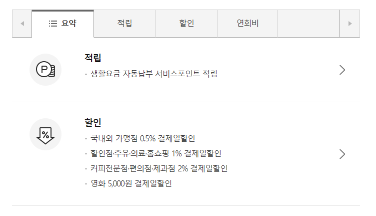 연회비는 3만원이고 대형마트·홈쇼핑·온라인쇼핑 10%, 통신·관리비 10%, 카페 5% 할인 등을 제공하고 있습니다.