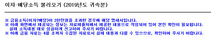 그러면 자동으로 이자, 배당소득이 불러와집니다. 참고로 2천만원 미만이면 조회가 안 됩니다. 신고대상자가 아닌 경우는 이렇게 확인이 가능합니다.