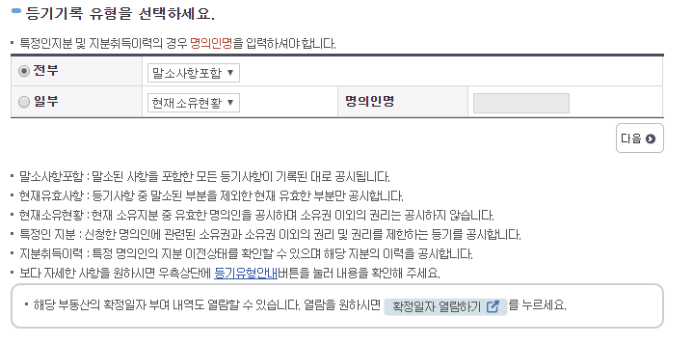 이러고 난 후에는 등기기록 유형 선택 후 다음을 선택합니다. 그 후 주민번호 공개여부를 선택하는데 필요서류 종류에 따라 미공개로 선택하셔도 무방합니다.