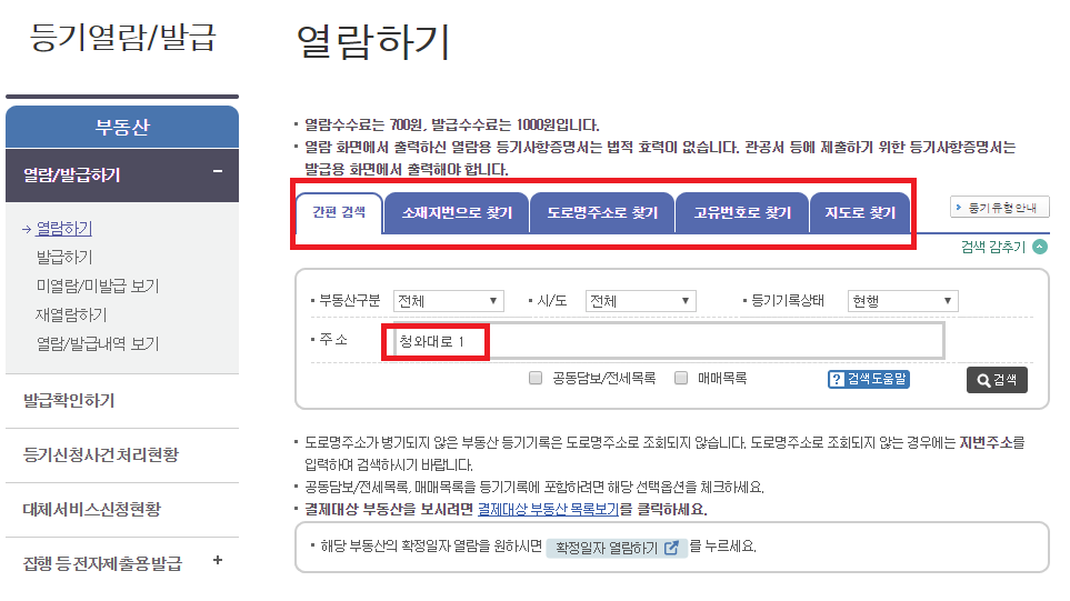 그러면 열람하기 메뉴의 소재지번, 도로명주소, 고유번호, 지도 등 다양한 옵션이 있습니다. 간편검색으로 해도 충분히 쉽게 검색이 가능합니다.