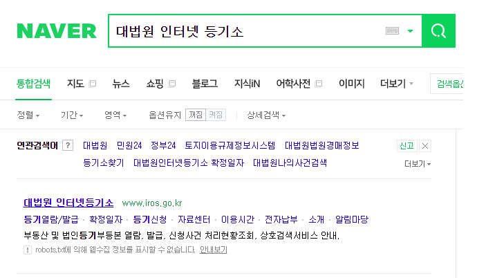 먼저 네이버에 대법원 인터넷 등기소를 검색합니다. 또는 주소는 www.iros.go.kr입니다.