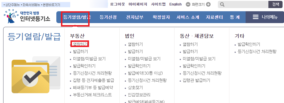 그 뒤에 상단 메뉴에서 등기열람/발급에서 부동산-열람하기를 선택합니다.