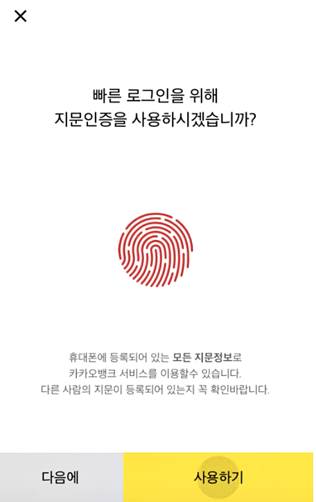 그 후에 실행하면 이름 주민번호로 본인 인증을 하면 됩니다. 이 이후에 다음에 로그인 때 지문으로 로그인할지 패턴으로 할지 비밀번호로 할지 골라주시면 됩니다. 저는 개인적으로 지문이 제일 편하여 늘 지문으로 하고 있습니다.
