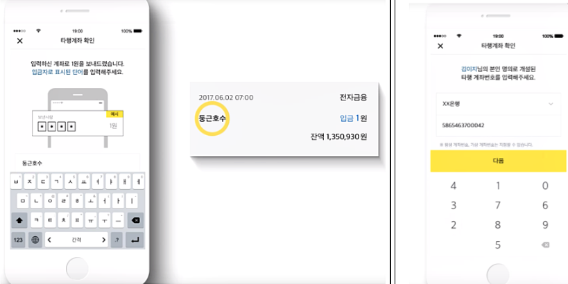 다음으로 카카오뱅크 계좌 개설방법 진행을 위해 다른 은행 인터넷뱅킹의 계좌로 1원을 넣어주며 거기에 카카오페이에서 입력한 암호 같은 게(예: 둥근호수) 뜰 텐데 그걸 입력해주면 됩니다.