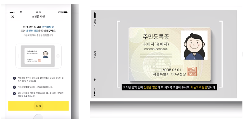 다음 카카오뱅크 계좌 개설방법입니다. 그 후 신분증인증을 해야 합니다. 여기서 중요한 건 카메라 안에 민증이 들어오게 해야 한다는 점인데요. 은근히 맞추기가 어려운데 다 맞으면 희열감이 있네요.