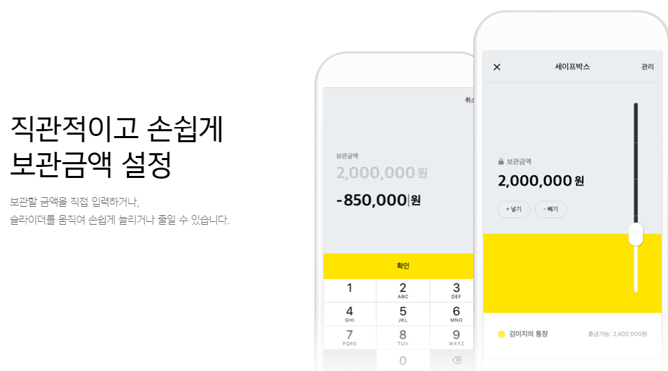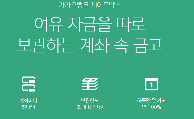 카카오뱅크 세이프박스란 쉽게 비상금 통장입니다. 여유 자금을 따로 보관하는 계좌 속 금고라는 개념입니다. 계좌마다 1개씩 설정이 가능하며, 최대 1천만원 보관 가능, 그리고 하루만 맡겨도 연 1% 이자를 제공합니다.
