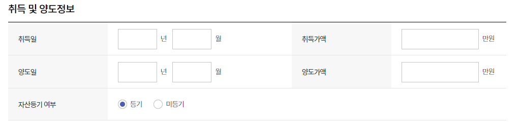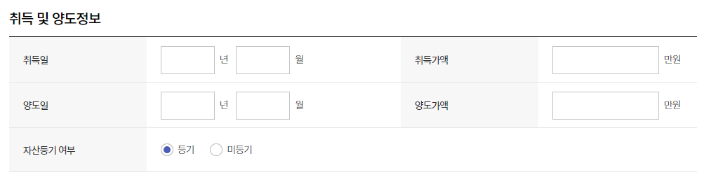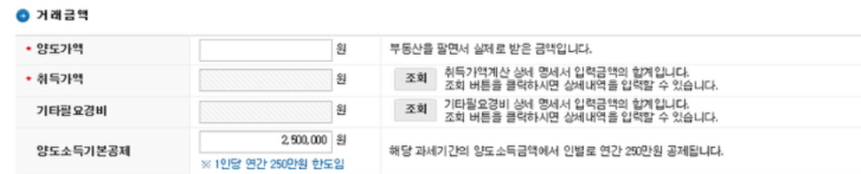 다음을 입력합니다. 취득일자는 실제로 내가 부동산을 취득한 날짜이며 양도는 내 부동산의 법적 소유가 상대방에서 이전되는 날짜입니다. 아래 250만원은 기본공제값이라 입력이 필요 없습니다.