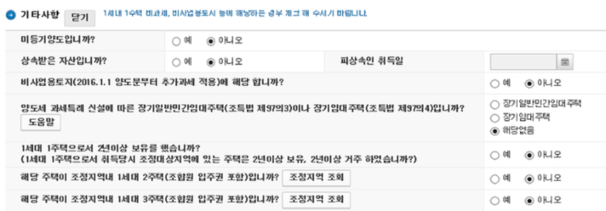 현재 보유주택 전용면적과 보유주택수를 입력해주는데 여기서 주의할 점은 1가구2주택이신 분들은 보유주택수를 2개라고 입력해주셔야 한다는 것입니다.