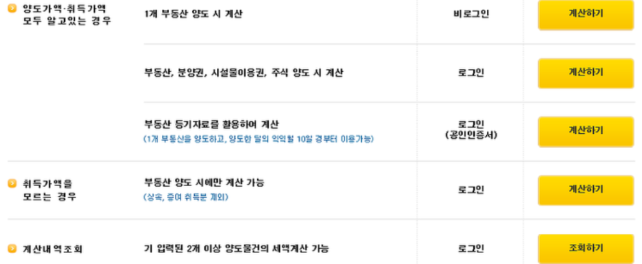 첫 번째에 뜨는 1개 부동산 양도 시 계산의 오른쪽 계산하기를 누릅니다. 여기에서 취득가액을 모르는 경우나 계산내역조회는 조회하기 버튼을 누르기 전에 로그인이 필요합니다.