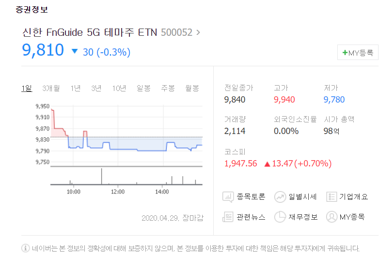 우리나라에도 존재하는 5g 관련 etf 테마주입니다. ETF는 아니고 ETN이긴 해서 만기도 있고 자산운용제한이 없긴 하지만 가져와보았습니다.