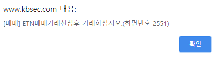 먼저 ETN, ETF 상품 거래를 위해서는 ETN 거래를 신청해야 됩니다. 이 경우 아무리 주식주문 메뉴에서 매수를 하려고 해도 바로 매수를 할 수는 없고 오류 팝업창이 뜹니다.