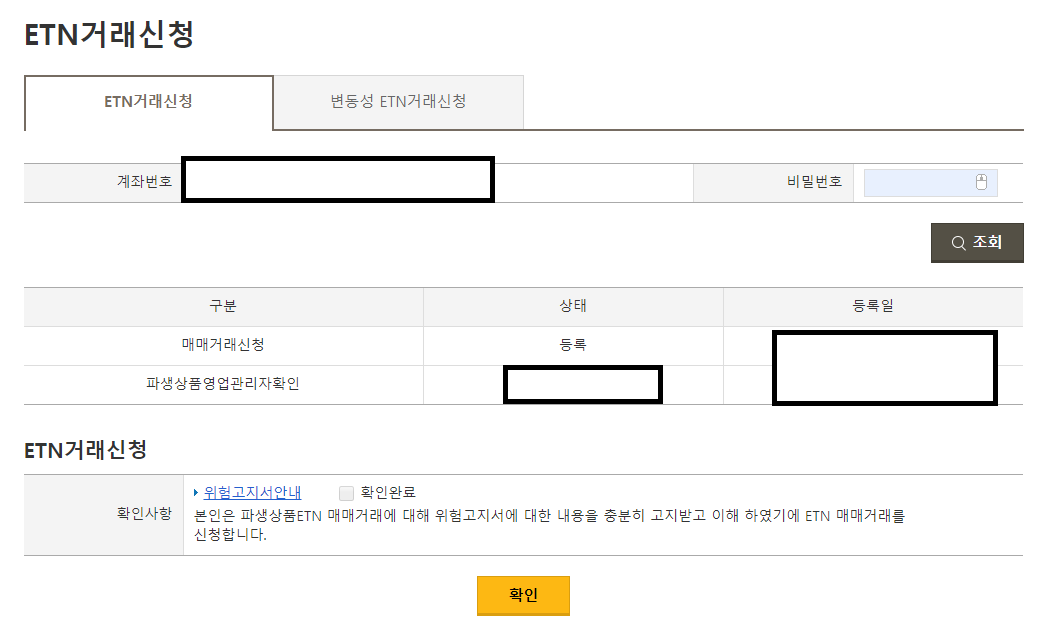 참고로 홈페이지상에서 2가지 메뉴가 나오는데, 위 메뉴로 신청을 꼭 해주셔야 됩니다. (ETN거래신청)