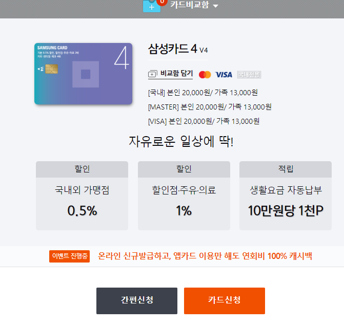 현재 이벤트도 하고 있어서 캐시백을 해주고 있습니다. 특히 제일 유명한 것은 삼성카드 4 V4입니다.