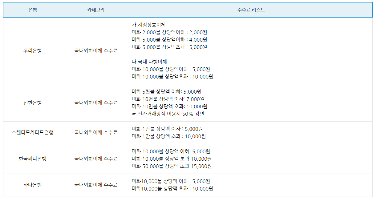 다들 비슷하게 건당 8천원이어서 줄세우기의 메리트가 없습니다. kb국민은행, 하나은행, 우리은행, 신한은행, 한국씨티은행, 스탠다드차타드은행 등이 있습니다.