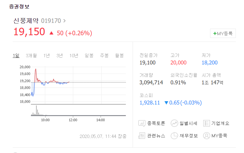 신풍제약 역시 클로로퀸 관련주로 분류되고 있습니다. 신풍제약은 클로로퀸을 직접 만들지는 않지만 최근 시험관내 시험에서 항말라리아제 '피라맥스'가 우수한 효과를 보인 것을 확인했다고 전했습니다.