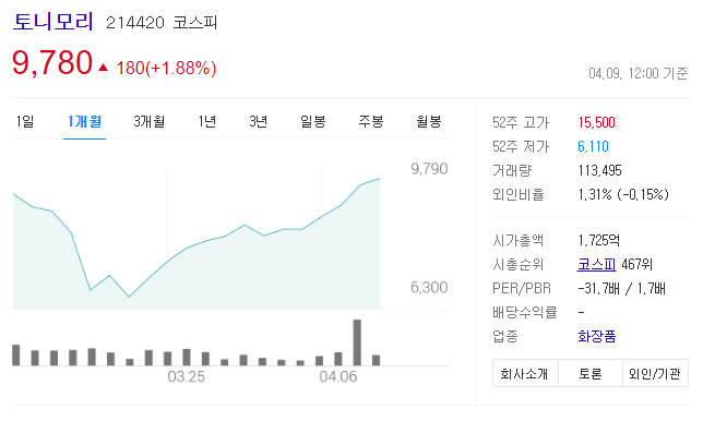 현재 토니모리 주가는 (214420) 2020년 3월 말쯤 8330원이었고, 현재 2020년 4월 9일에는 9780원으로 높은 상승률을 보여주고 있습니다. 52주 저가는 6110원이었으며 고가는 15500원이었습니다.