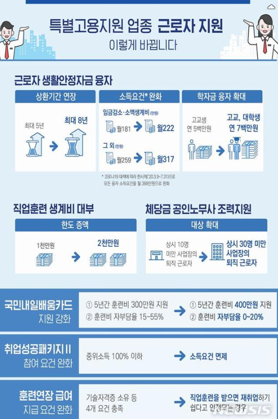 이것은 고용노동부 장관과 심의회가 지정할 수가 있으며, 이에 대한 생계비, 재취업 훈련, 전직 훈련 등을 정부가 지원합니다.